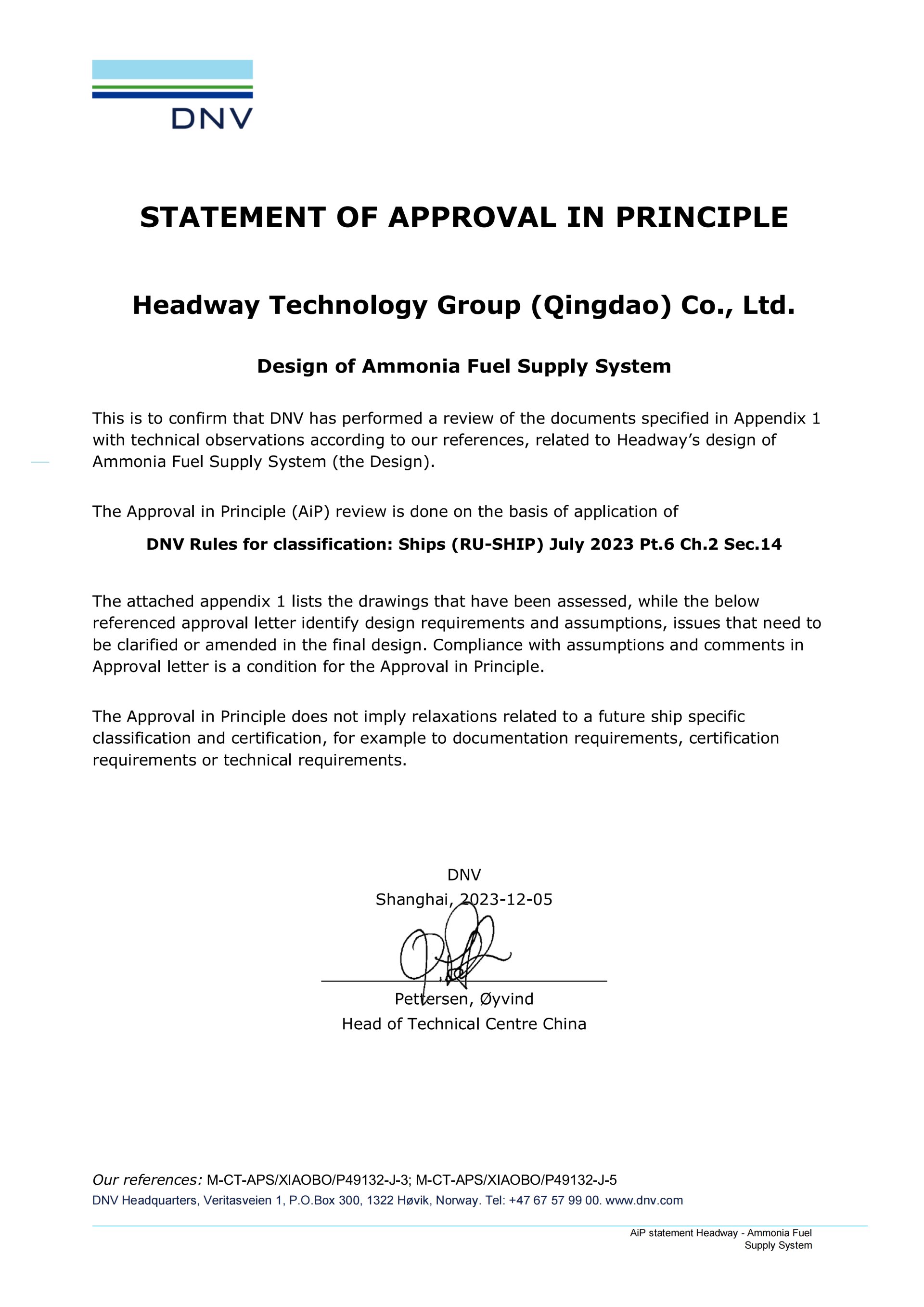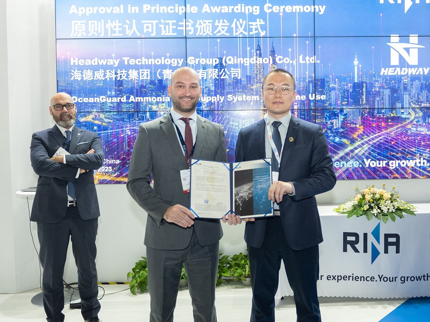 2023年中國(guó)國(guó)際海事會(huì)展上,海洋衛(wèi)士?氨燃料供給系統(tǒng)正式取得DNV船級(jí)社和RINA船級(jí)社授予的原理認(rèn)可證書,標(biāo)志著海德威低碳航運(yùn)產(chǎn)品生態(tài)再度擴(kuò)軍并取得業(yè)界權(quán)威認(rèn)可。